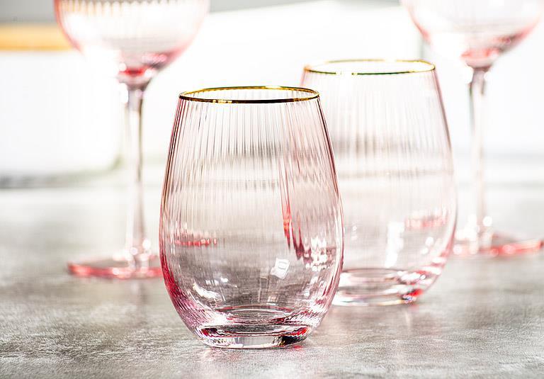 Elevate your entertaining with our chic Abbott Pink Optic Wine Glass. Crafted from pink optic glass, this 18oz stemless goblet features a stylish gold rim for a touch of sophistication. Add a fun rose hue to any vintage and make a statement at any occasion. Other Pink Optic Glassware also available.