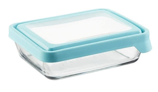 Experience the convenience and durability of our Blue Glass Storage Container with Lid. Made in the USA by Anchor Hocking, this rectangular storageware container boasts a generous 11 cup capacity and is microwave, oven, freezer, and dishwasher safe. The tempered glass ensures even baking, while the durable plastic lid keeps food fresh. A smart choice for your health and the environment.