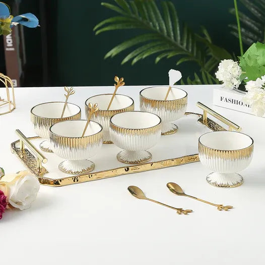 Featuring an upscale, exclusive gold / pearl trim and coordinating tray and spoon! These dessert mugs will transform every tablescape!