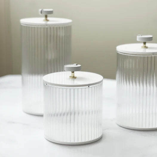 Elevate your sweet treats with our Clear Corrugated Lucite Cookie Jar. Made with high-quality corrugated lucite, it adds texture and transparency to your display. The sleek white lid with a leatherette handle and magnetic closure keeps your treats fresh and irresistible. Available in various sizes, it's the perfect gift for any occasion.