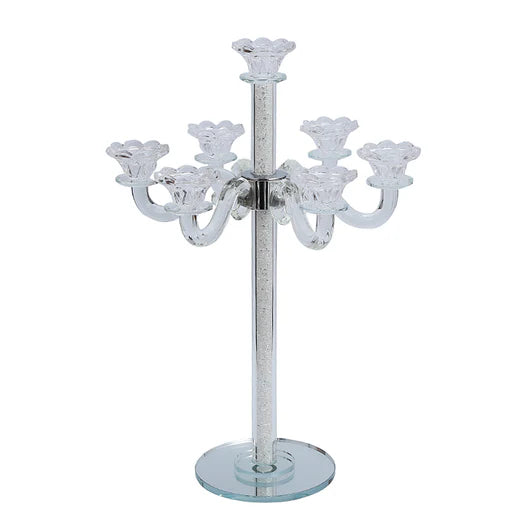 This elegant crystal candelabra with 7 arms is an exquisite specialty. Its tall stem filled with crushed gemstones lends a regal touch to your candle lighting experience!