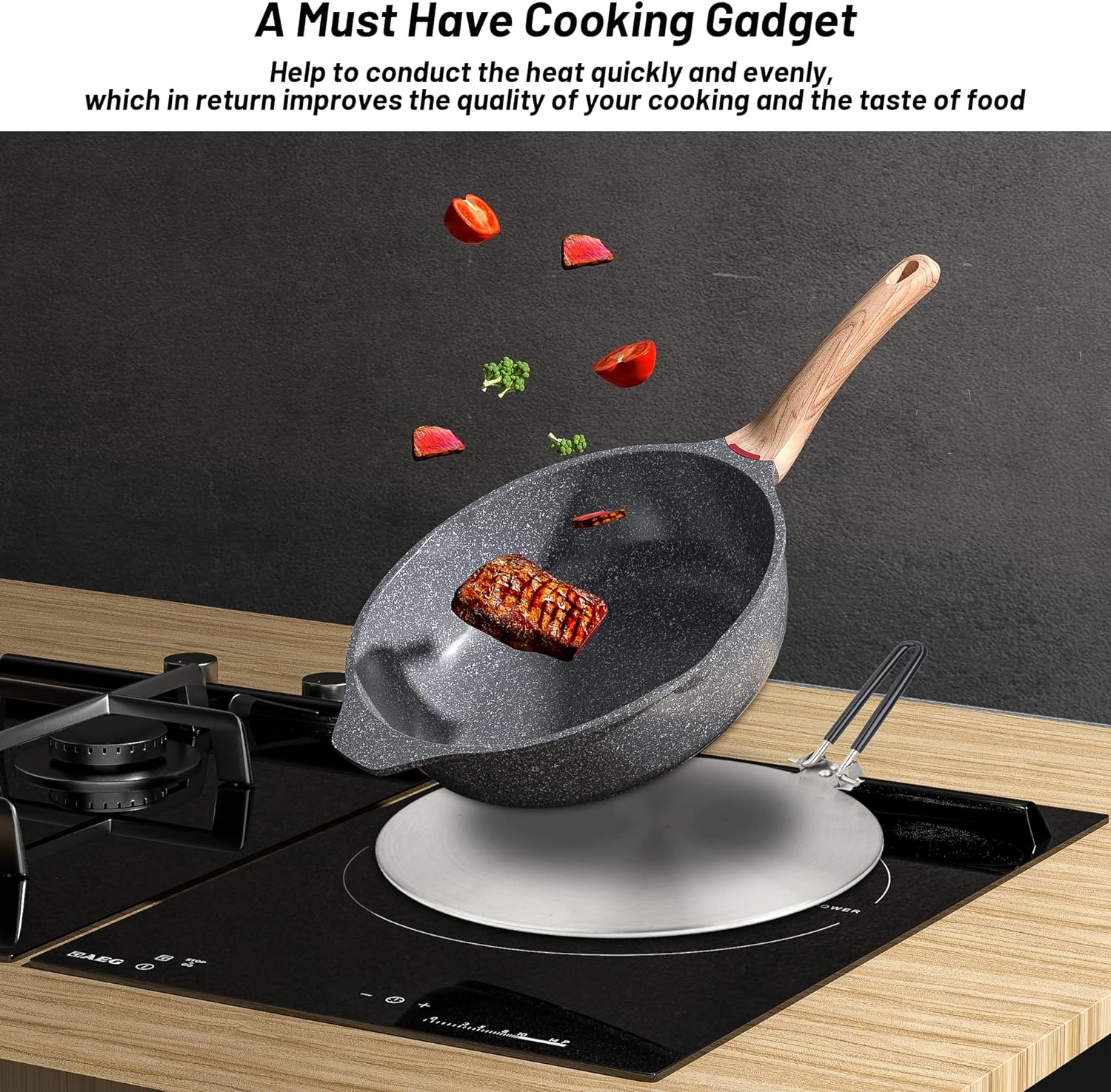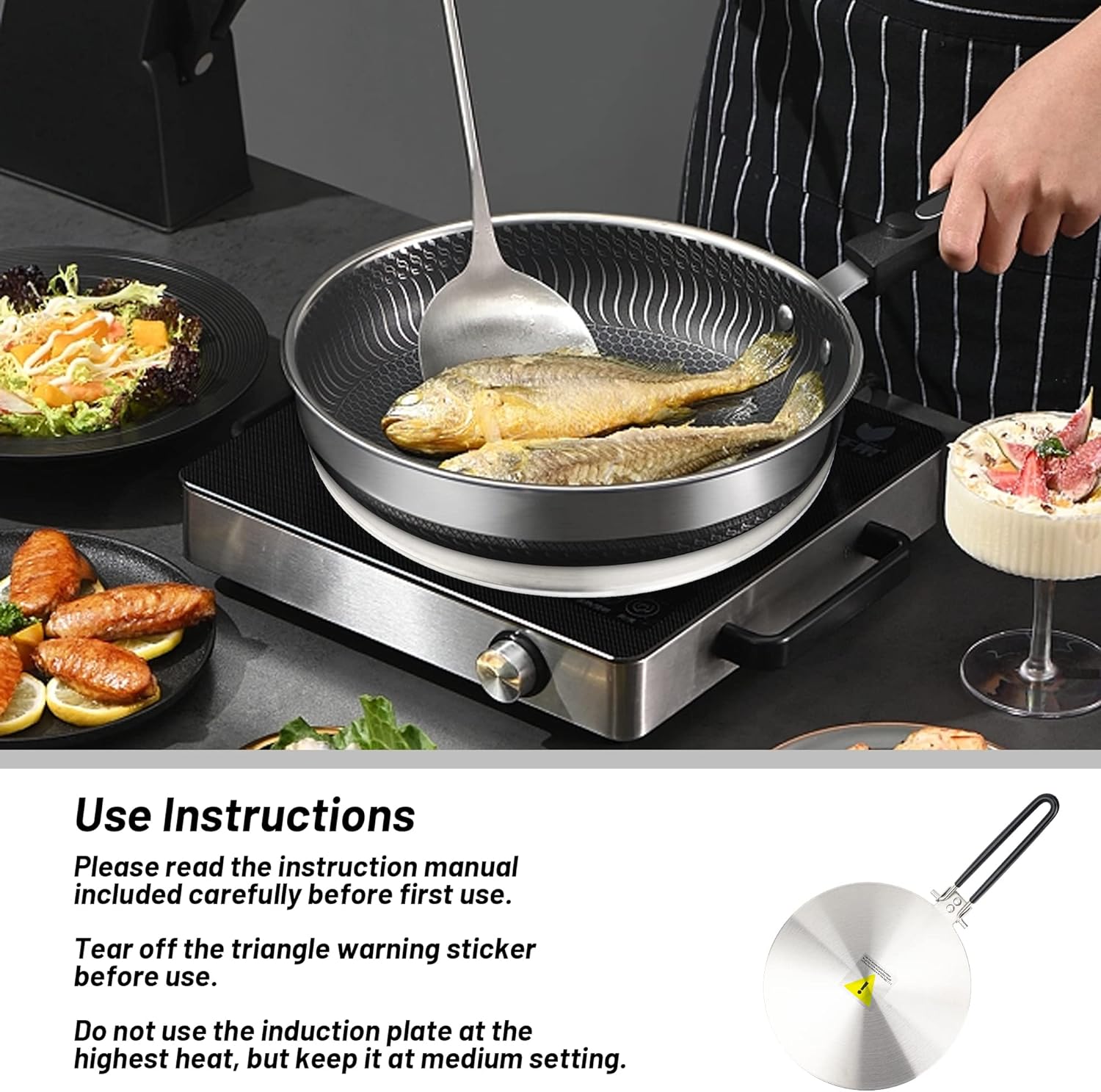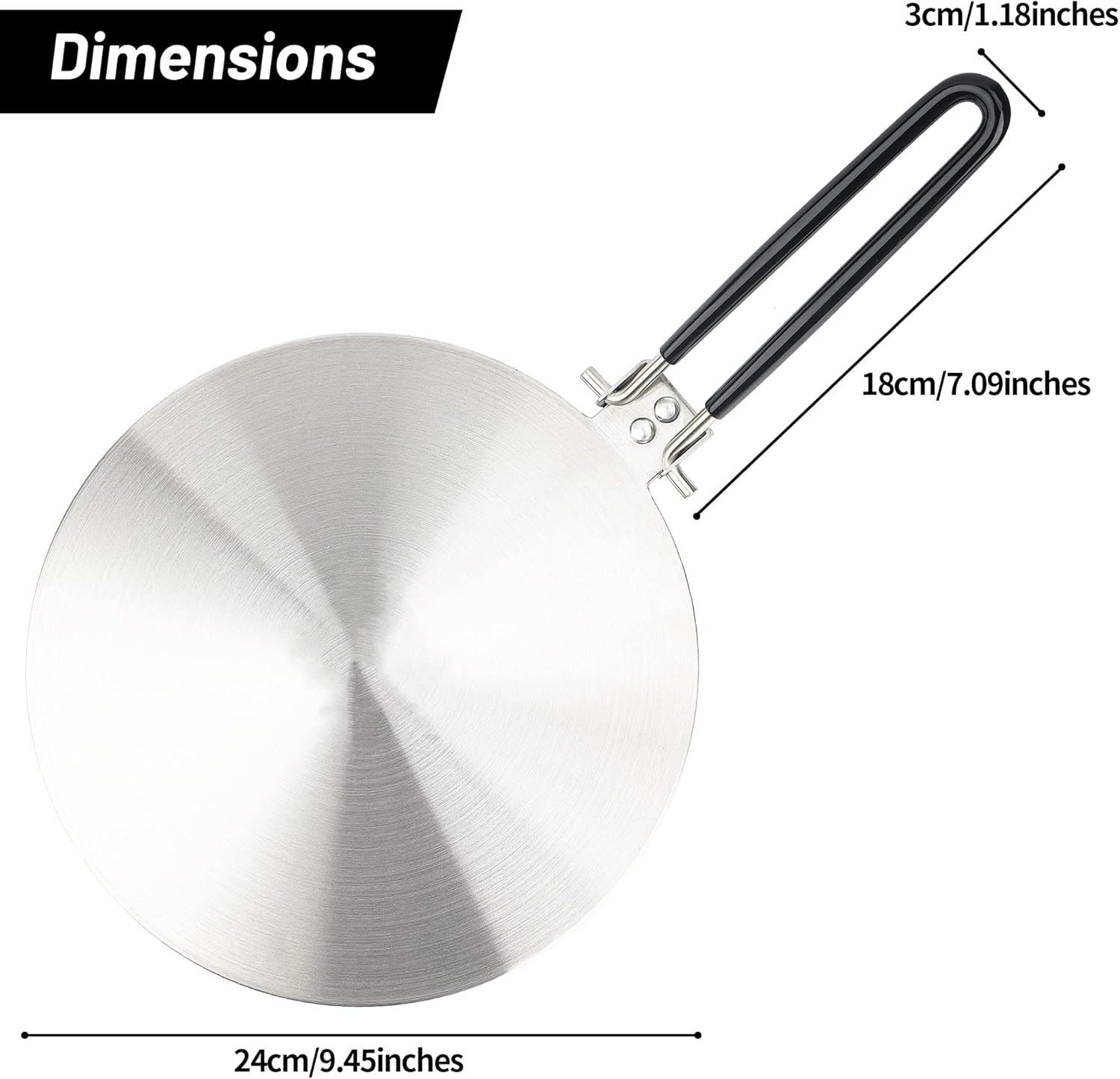 The Stainless Steel Induction Adapter for Glass Cooktop 9.5" 1pc is a durable and reusable gadget for your kitchen. Its three layers, made of stainless steel and aluminum, distribute heat evenly for improved cooking. The heat-insulating handle and compatibility with most induction cookers make it a must-have kitchen essential.