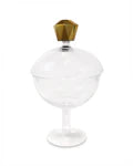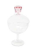This Glass Footed Jar With Colored Diamond Shaped Handle is a functional and elegant storage solution, available in two sizes. The glass material allows for easy viewing of displayed items and the diamond-shaped handle adds a touch of sophistication. Perfect for organizing and showcasing your favorite belongings in a stylish yet practical manner. Dimensions: Medium - 3.25"D x 5"HLarge - 5.5"D x 9.5"H