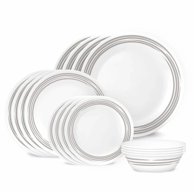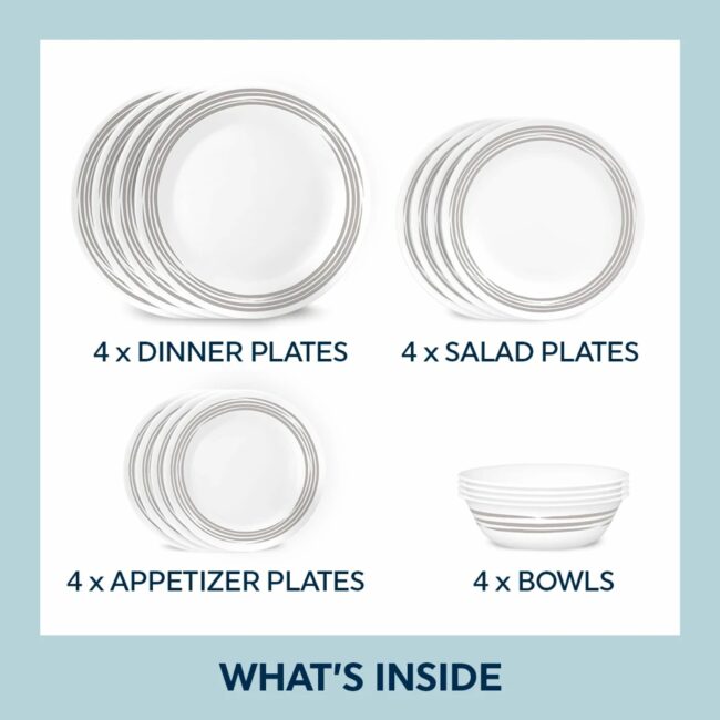 Expertly crafted with a sleek silver brushed design, the Corelle Silver Brushed Dinnerware Set adds a touch of elegance to any table setting. Made with Corelle's proprietary material, this 16-piece set is lightweight yet durable, making it perfect for everyday use. The set includes four dinner plates, four lunch plates, four cereal bowls, and four mugs, providing everything you need for a complete dining experience. With its chip and scratch resistance, this dinnerware set is both practical and beautiful. Upgrade your dinnerware with Corelle Silver Brushed.