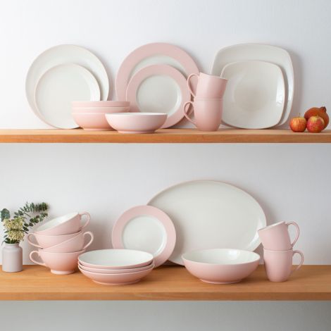 Colorwave Pink features a matte coloration on the outside suggestive of carnations, cotton candy, and flamingos. Most items also have a glossy, cream-colored glaze on the inside. Mix and match the different shapes and add a splash of color to your table! Colorwave offers place setting components as well as an array of serving pieces and accessories.
