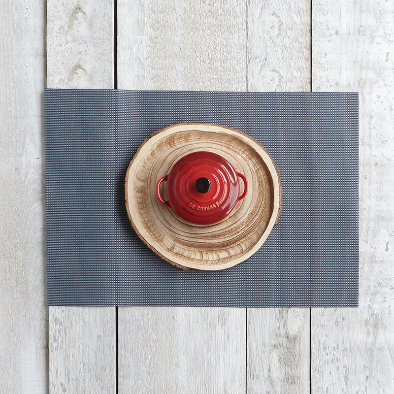 Elevate your dining aesthetic with this Blue Elite Vinyl Placemat, where sophisticated tabletop fashion meets practical functionality. The refined woven pattern adds visual interest to any table setting, whether you're hosting an intimate dinner or enjoying outdoor entertaining. Crafted for versatility, this placemat transitions seamlessly between indoor and outdoor use, making it an essential addition to your table décor. Maintenance is effortless—simply wipe clean with a damp cloth to maintain its pristine appearance. At 13" x 19", it provides generous coverage for standard place settings. Invest in tableware that combines style with durability.