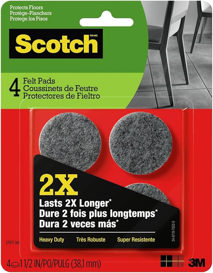 The Scotch Gray Heavy Duty Felt Pads are the perfect solution for protecting your floors and other surfaces from scratches. These pads are designed to last longer than standard felt pads, making them a wise investment for your home. Whether you have hardwood floors or tile with grout lines, these pads offer reliable protection. Keep your floors looking pristine with these heavy-duty felt pads.