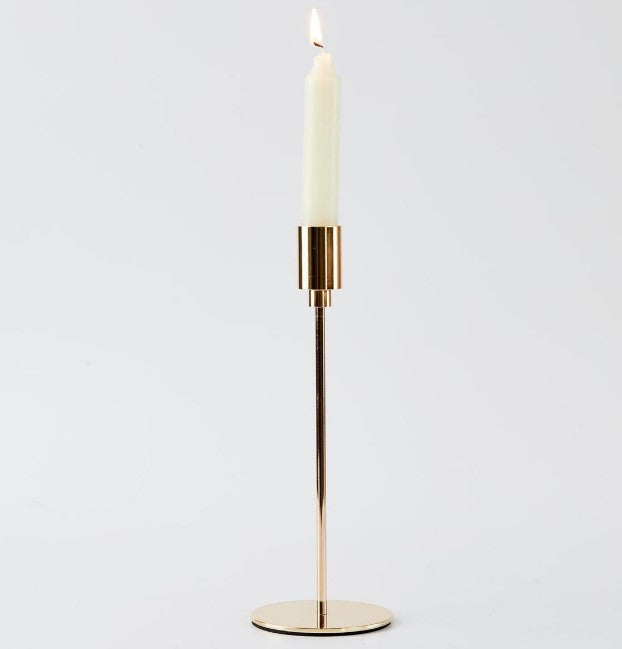 Elevate your table setting with this refined gold metal candle holder, designed to showcase a single taper candle with understated elegance. Standing 9 inches tall, its tapered silhouette creates a graceful focal point that complements both contemporary and traditional décor. The warm metallic finish catches candlelight beautifully, casting a sophisticated ambiance across your dining space. Perfect for intimate dinners, special occasions, or everyday refinement.