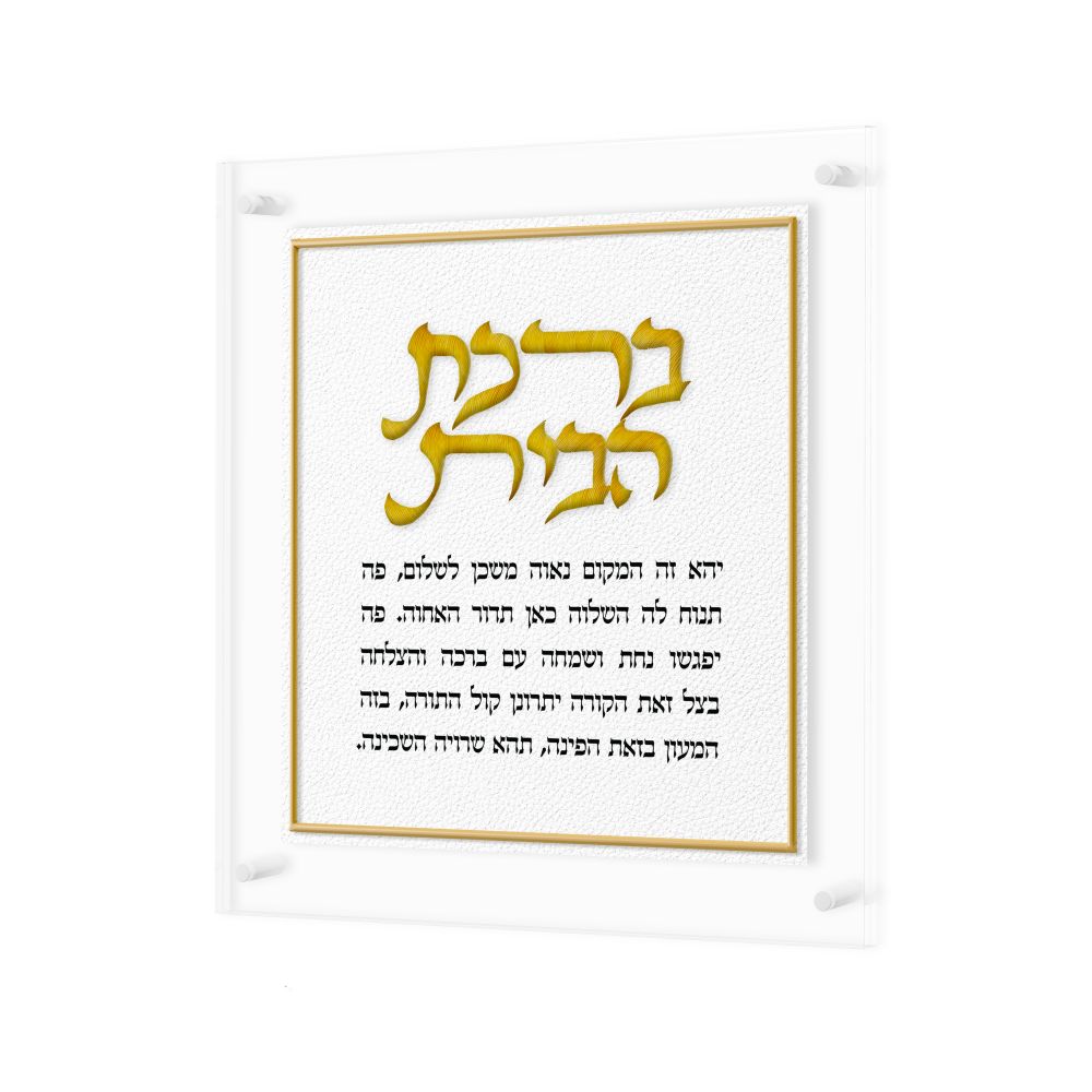 Enhance your home with the Feldart Gold Leatherite Birchas Habayis. Made with elegance, this piece features luxurious leather between two Lucite panels, showcasing an intricate embroidered design. Complete with white standoffs, the piece floats off the wall for an exquisite touch.