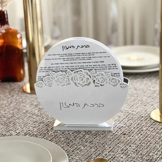Introducing our exclusive White Lucite Round Bencher Set, a must-have for any elegant shabbos table setting. Its sleek laser cut flower design and mirrored text make it an eye-catching addition to any meal. The white cards and 8" diameter provide maximum comfort for Birchas Hamazon. Perfect as a gift, with dimensions of 7.8" for cards and 8.5 x 8.4" for the box.