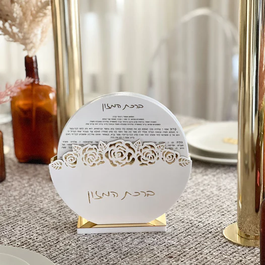 Introducing our White/Gold Lucite Round Bencher Set, the perfect addition to any shabbos table setting. This 6pc set is not only elegant and stylish, but also functional, with 7.8" cards for maximum comfort during Birchas Hamazon. The sleek and eye-catching laser cut flower design will make a statement and is sure to impress. Makes for a great gift idea. Dimensions: Cards - 7.8", Box - 8.5 x 8.4".