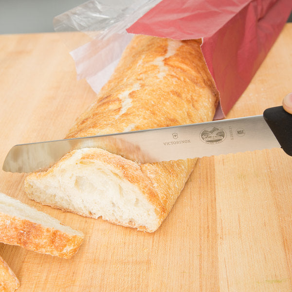 The Victorinox 47549 8" slant tip serrated bread knife makes cutting through large loaves of bread a simple task. Designed for exceptional durability, Victorinox lasts up to 60% longer than typical knives, making this piece a valuable workhorse. The perfect addition to your knife collection, this bread knife is sure to become a favorite in any kitchen!