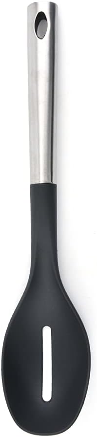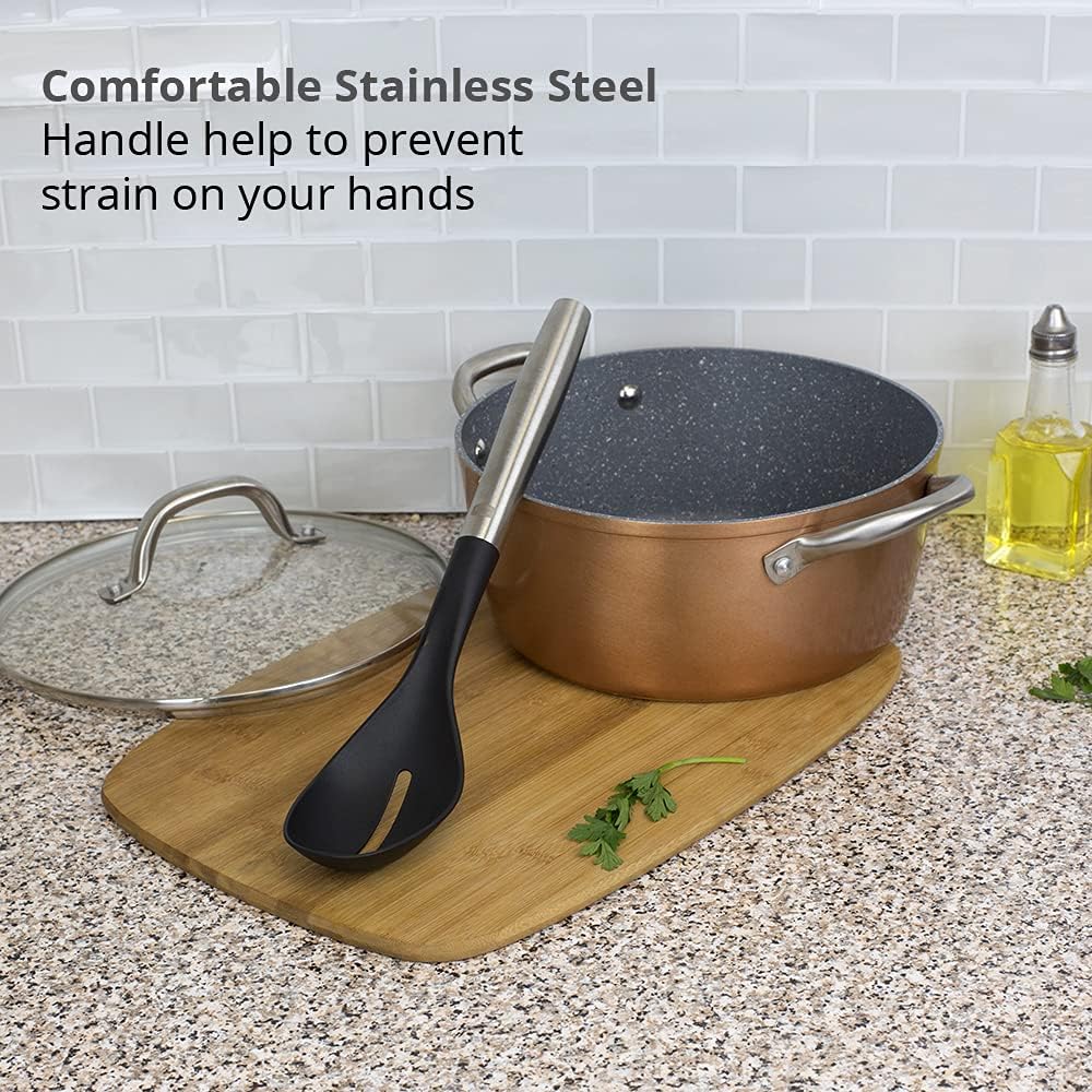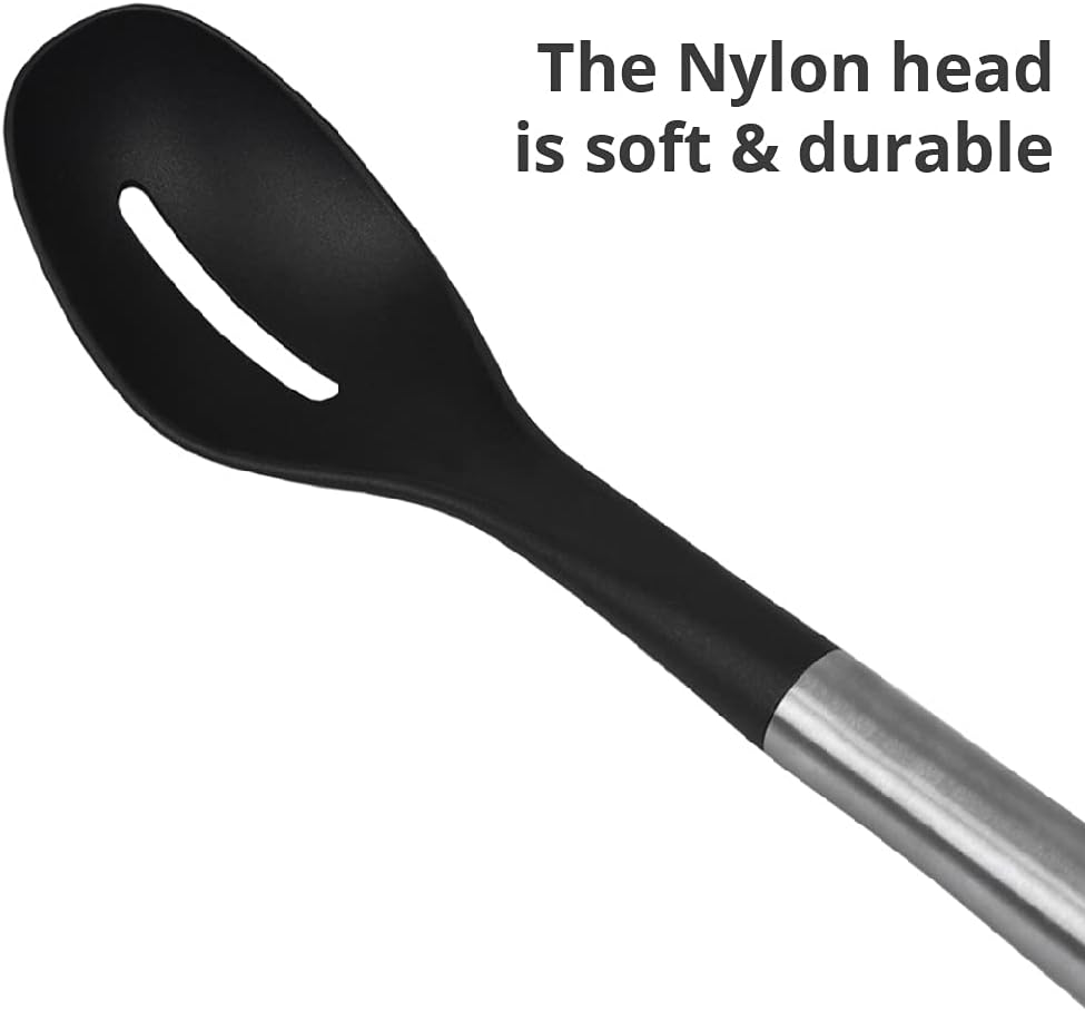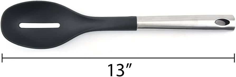Enhance your cooking experience with the L. Gourmet Black Slotted Spoon. Made from premium quality, temperature resistant nylon, this 13" slotted spoon is perfect for nonstick cookware and is dishwasher safe for easy cleaning. Upgrade your kitchen utensil collection and add convenience to your cooking.