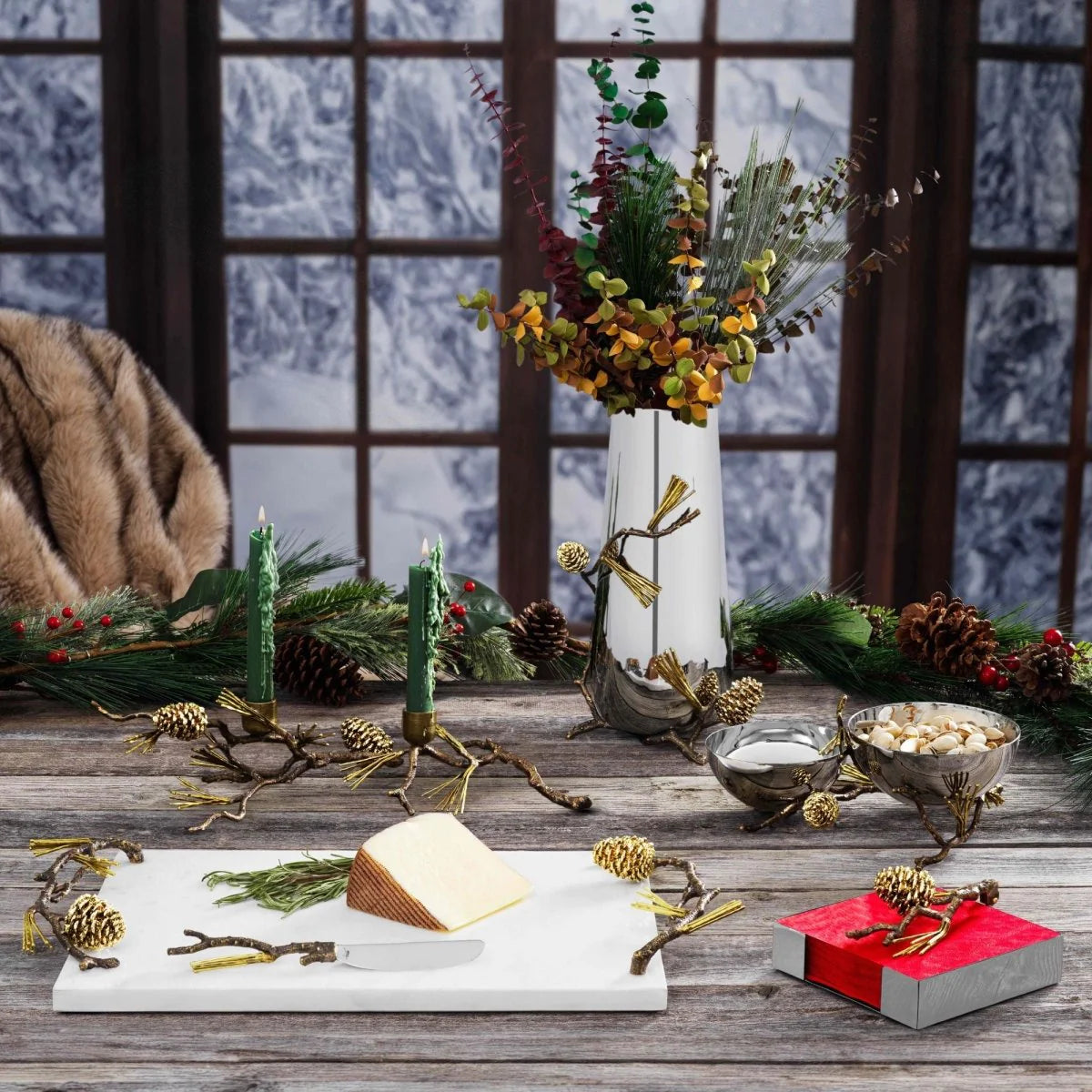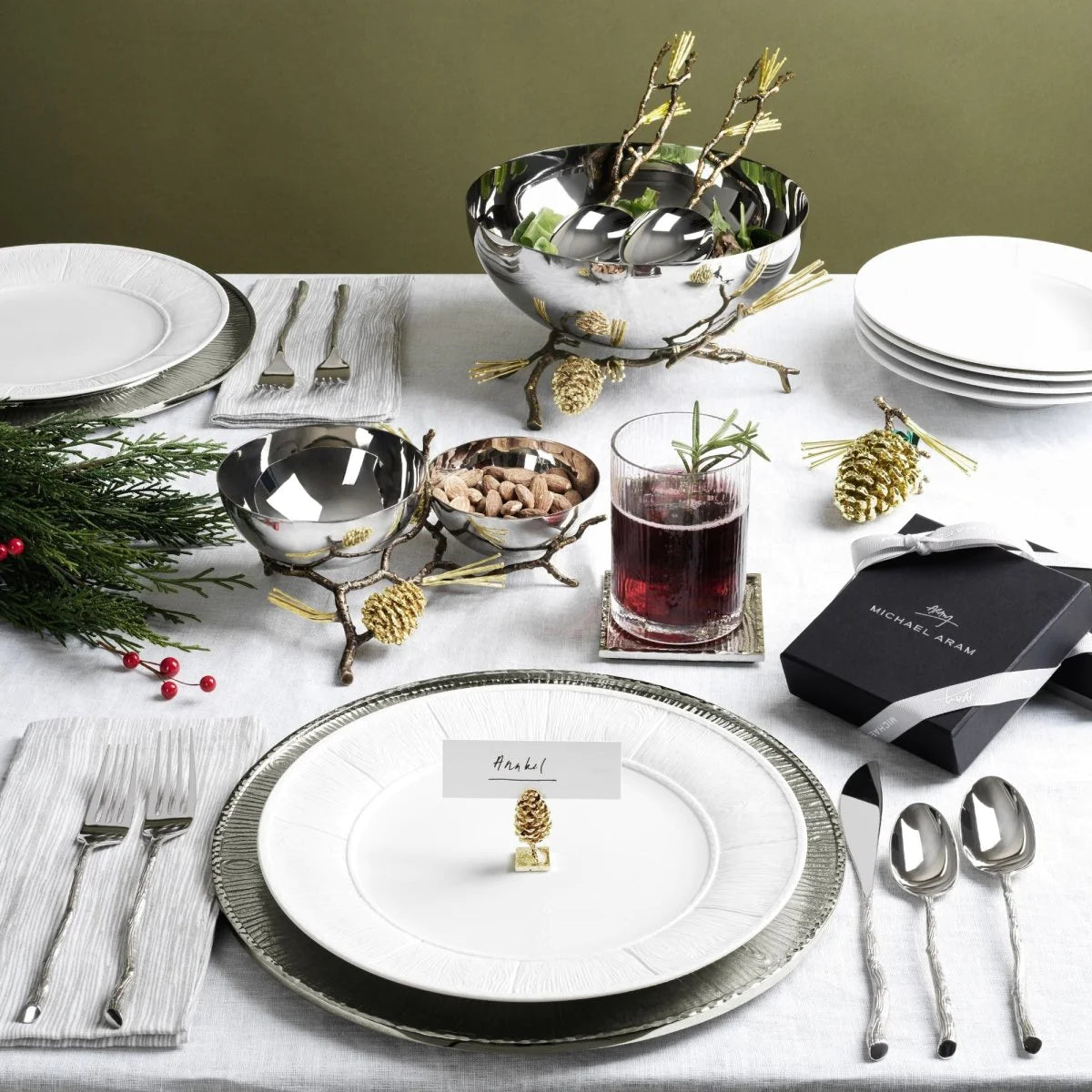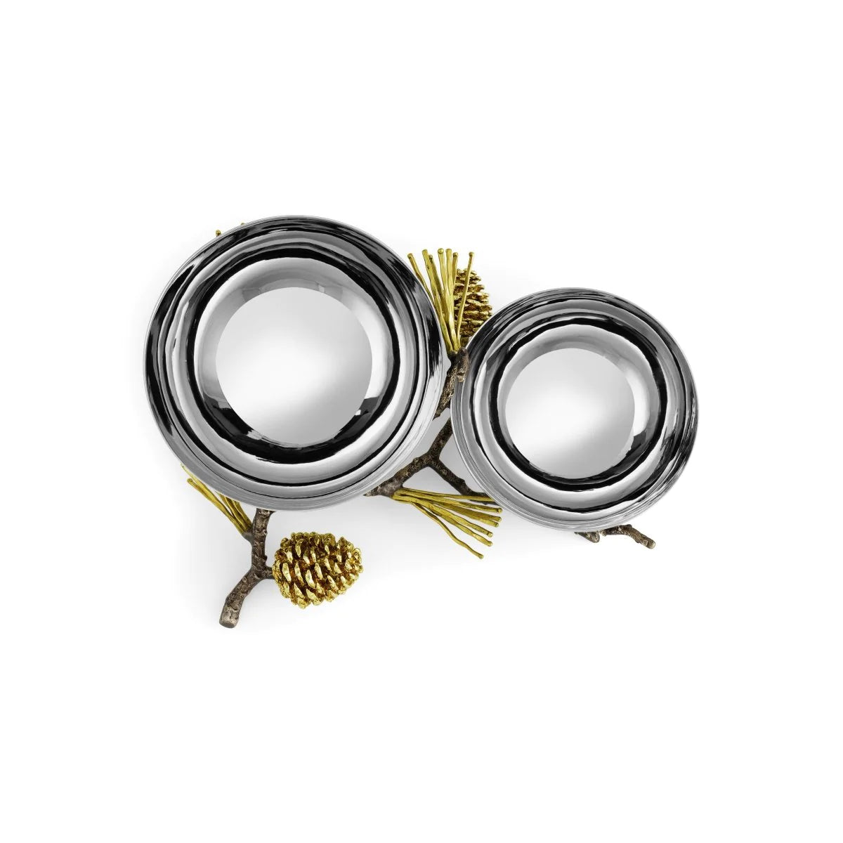 The Michael Aram Pine Cone Double Bowl embodies the magic and joy of the holiday season. Inspired by the ancient symbolism of pinecones, this collection celebrates regeneration, wisdom, and renewal. The antique gold and darkened bronze patinas add a warm and festive touch to any home.