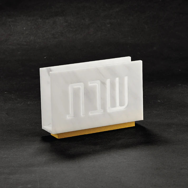The Shabbos Laser Cut Napkin Holder brings modern elegance to your Shabbos table.  Featuring a sleek, laser-cut design of the word 'Shabbos,' it adds a refined and stylish touch to your setting. This holder is enhanced with a painted gold base for a touch of sophistication.