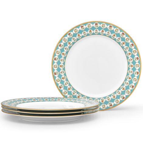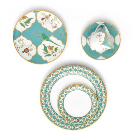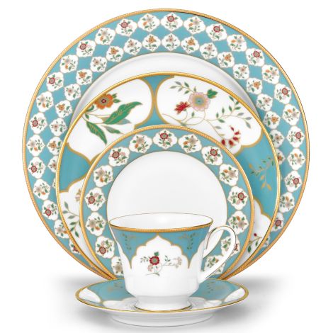 Lodi's Morning is a white porcelain pattern, showcasing designs inspired by the renowned Lodi Gardens in India. The salad plate displays vivid florals and a parakeet in a stunning blue hue with hints of saffron and ruby, while the remaining pieces feature a striking rim of florals surrounded by a repeating ogee border. A delicate gold band adorns the outer edge, adding a finishing touch to this charming pattern. Lodi's Morning is dishwasher safe and intended for everyday use.