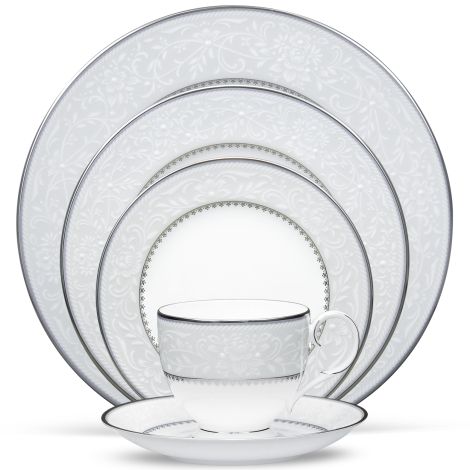 The Noritake Silver Brocato Dinnerware Set 5pc is the perfect blend of sophistication and durability. Made of bone china with an antique floral lace design, this set also features a platinum band and a touch of cadet grey. Ideal for daily use, it's dishwasher safe and includes place settings, serving pieces, and accessories. Elevate your dining experience with Brocato.