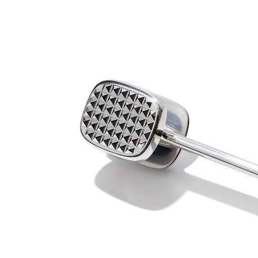 Meat Tenderizer, 24cm (9.5") H, die cast steel. Designed to flatten and tenderize poultry, pork and beef. Features a flat side for pounding and a textured side for tenderizing. The head is weighted and angled for optimal flattening. Extra sturdy, solid construction ensures it will stand up to frequent use. Soft handle cushions hands and absorbs pressure.