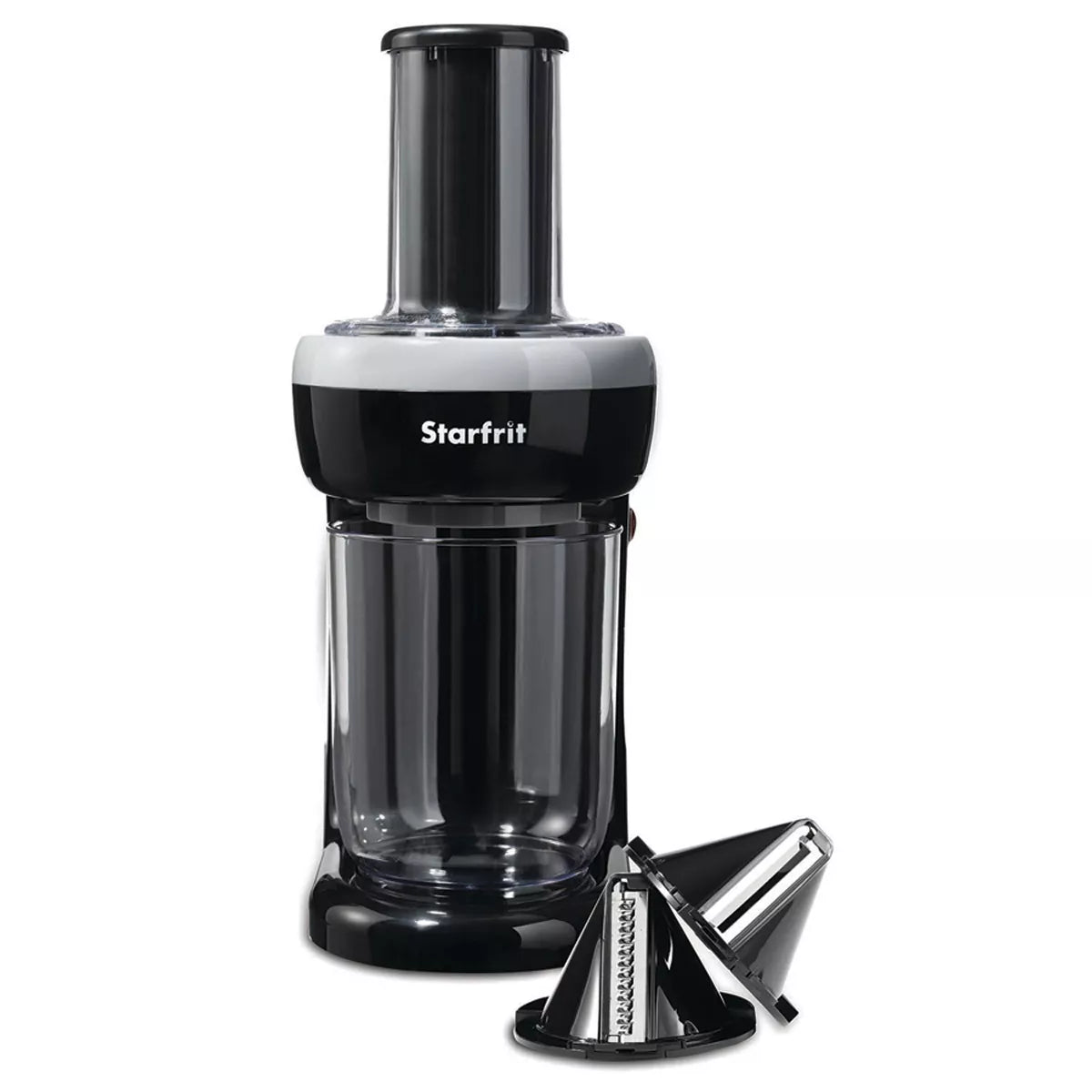 Transform your favorite vegetables into long ribbons or spirals with the Starfrit Electric Spiralizer. Its 2 interchangeable stainless steel blades make it perfect for cucumbers, carrots, zucchinis, and more. With a locking mechanism for added safety and detachable parts for easy cleaning and storage, this spiralizer is a convenient and healthy choice.