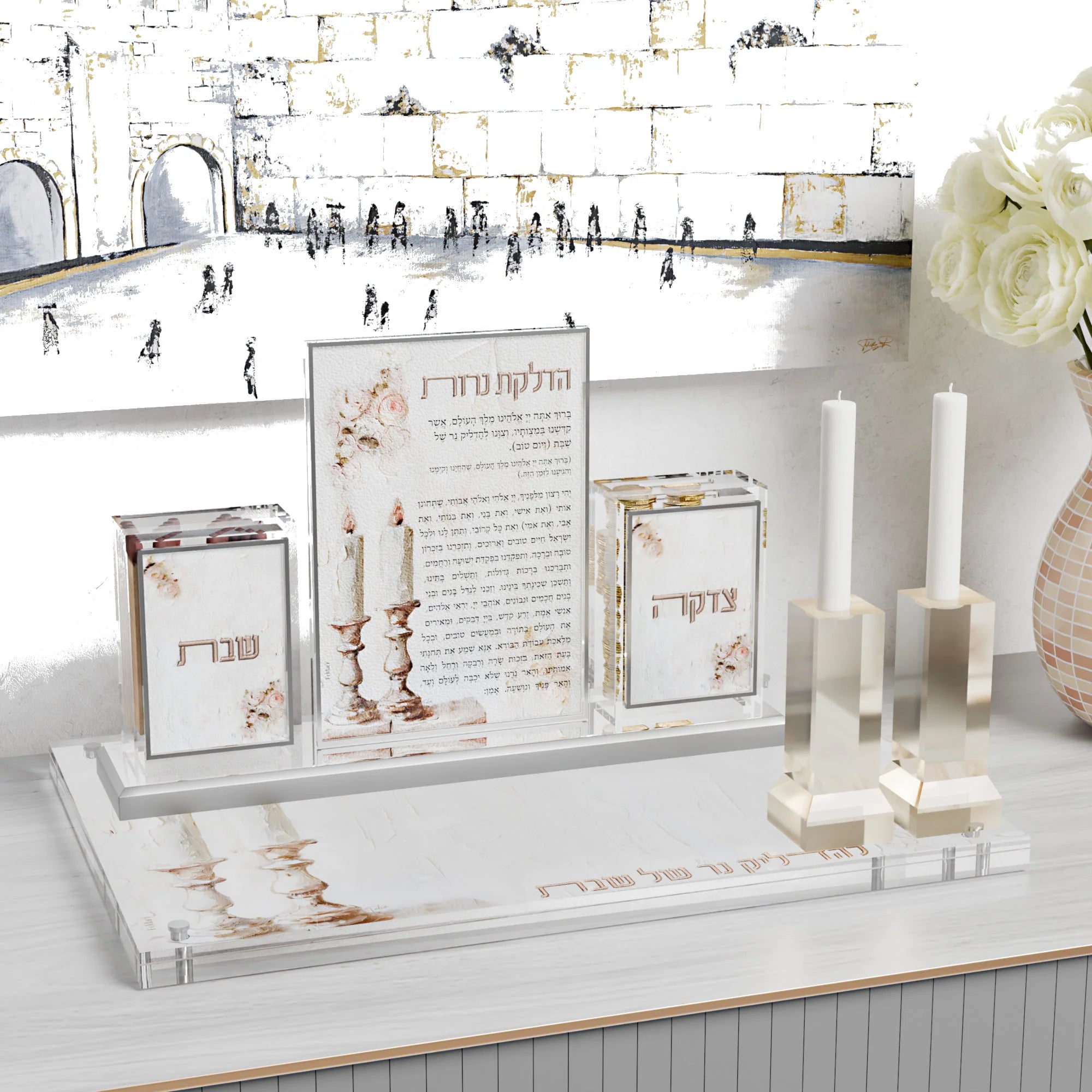 Experience luxury and tradition with the Feldart Pink Leatherite Blush Hadlakos Neiros Set. Crafted with real leather and 3D raised borders, this set includes a Brochos Card, Tzedakah Box, and Match Holder. Elegant and functional, it makes the perfect gift for any special occasion. Each piece is also removable for easy storage. Dimensions: 13.4" x 2.75" x 8".