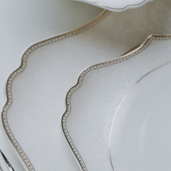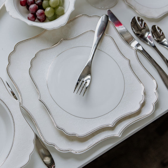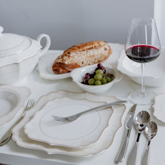 Studio 18-piece dinnerware set for 6 features a unique plate shape and attractive border design that makes it a great addition to your tableware collection. It will add beauty to any dinner party, events, family dinners, and even for everyday use. This dinnerware set includes 6 pieces each of dinner plate, soup plate, and salad plate. The elegant and classic design and cream color of these plates add sophistication and style to your table scape and complements the rest of your table décor accessories. Made of bone china, each of these plates offers durability and their color and quality remain the same, after years of long use. Impress your guests by serving them on these unique elegant shape and design plates. The set is for serving 6 people. The perfect gifting accessory too for thanksgiving, Christmas, Hanukkah, and festival dinners.