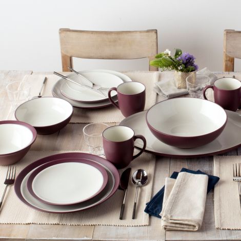 Colorwave Burgundy features a velvety, rich color on the exterior reminiscent of radicchio, black cherries, and red wine, while the interior boasts a shiny, cream-colored finish. Experiment with different shapes and introduce a burst of color to your dining experience. Crafted from stoneware, this set eliminates the need for a band and is both dishwasher and microwave safe for convenience.