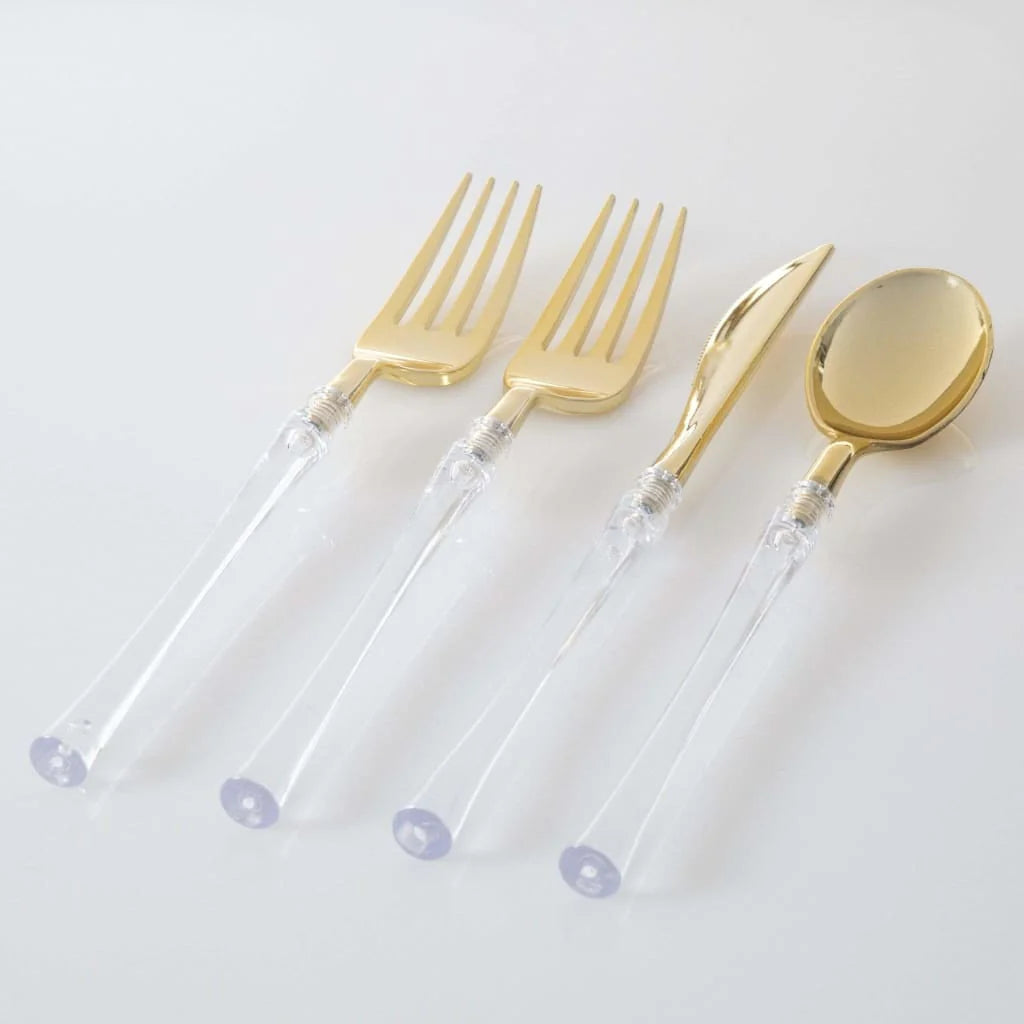 This Clear/Gold Neo Classic and Plastic Cutlery Set includes 32 pieces, perfect for any occasion. Made with high-quality materials, this set offers a sleek and elegant design while being durable and practical. Enhance any dining experience with this timeless and stylish cutlery set.
