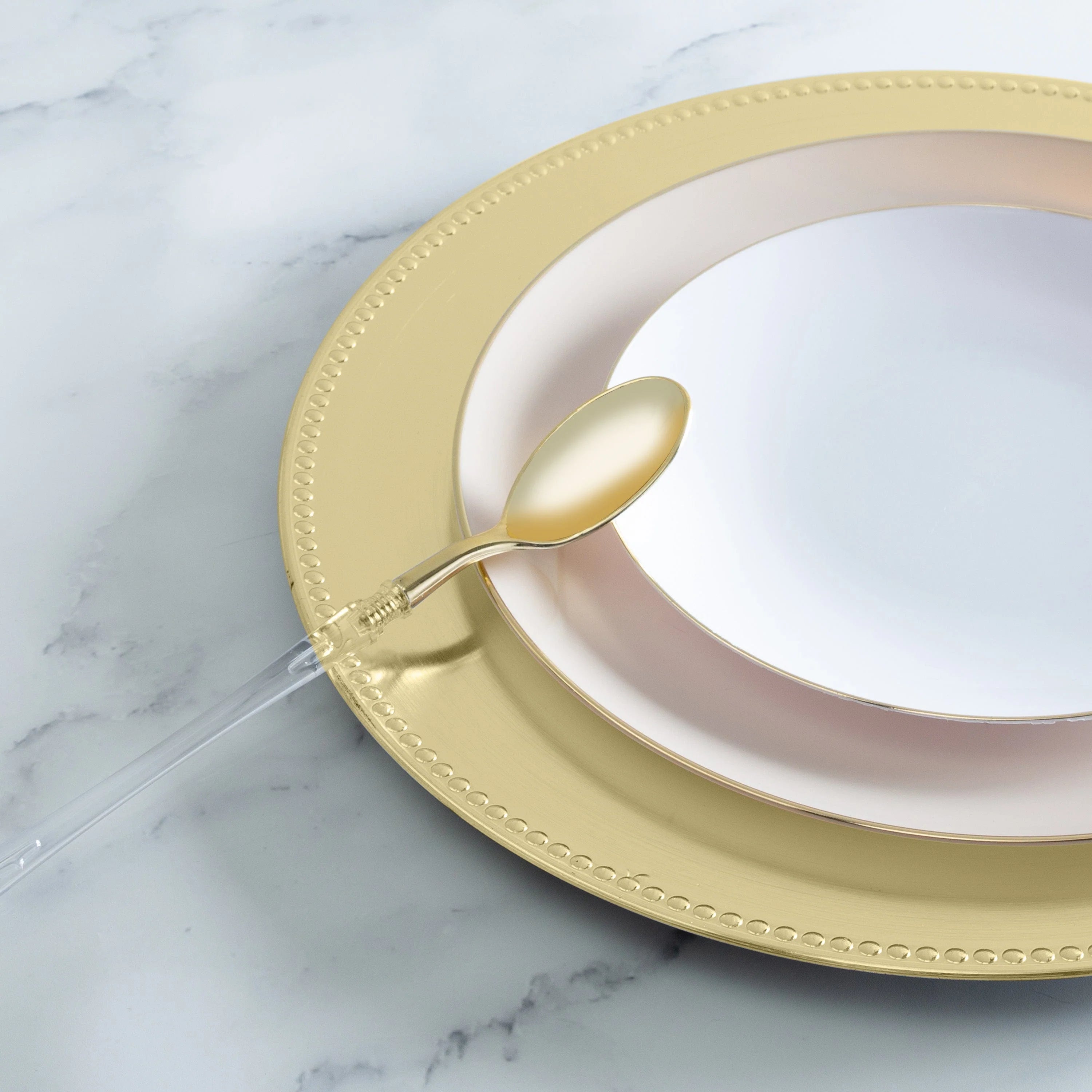Bring a touch of sophistication to your next event with the Gold Beaded Plastic Charger 13" 1pc. Perfect for any occasion, this 13" gold-colored round charger plate adds a classic and elegant charm. Its beaded detailing completes the luxurious look and makes each plate perfect for a memorable and unique evening.