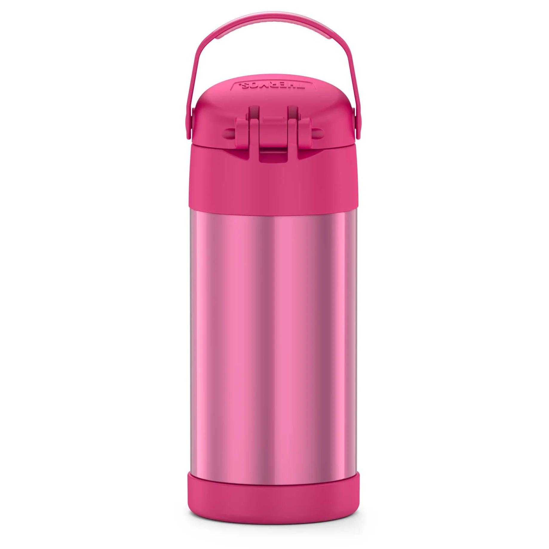 The FUNtainer® 12oz Vacuum Insulated Stainless Steel Water Bottle with Straw keeps drinks cold for up to 12 hours. The double wall stainless steel construction is built to handle drops, dings and assorted roughhousing. Includes an integrated carry handle with soft-touch grip, making it easy for kids to carry with them throughout the day. Help keep germs away with the hygienically covered silicone straw which is removable for easy cleaning. To clean, you can pop your FUNtainer water bottle in the dishwasher; however hand washing is recommended. Not for use with hot liquids. Label your FUNtainer bottle with adhesive name stickers that can be firmly adhered to any FUNtainer product. Two peel and stick labels are included inside this FUNtainer product. Fun for the kids, and easy for the parents. Just write, peel and stick!