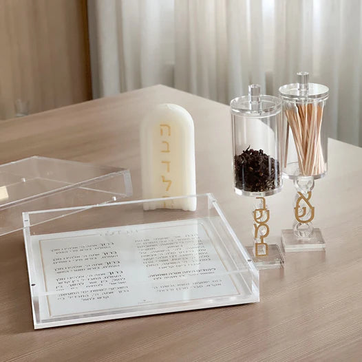 Expertly crafted, this 4pc Lucite Havdalah Set is a must-have for any celebration of the Jewish faith. Made from high-quality Lucite material, this set includes all the essentials for the ritual, including a kiddush cup, spice box, candle holder, and tray. Elevate your Havdalah experience with this sleek and elegant set.