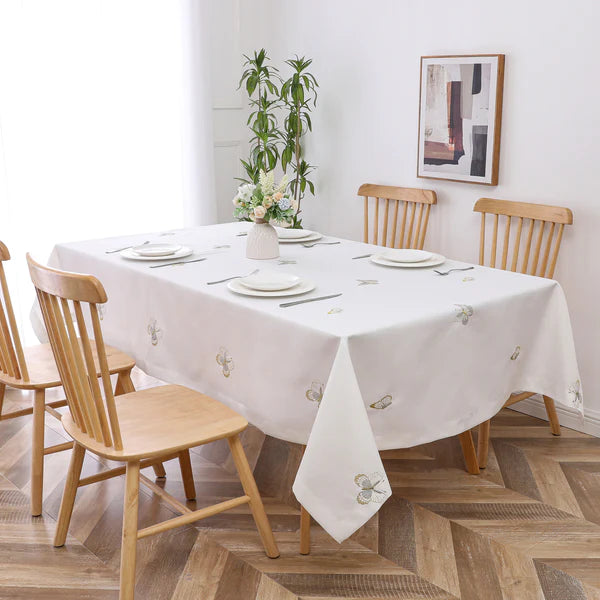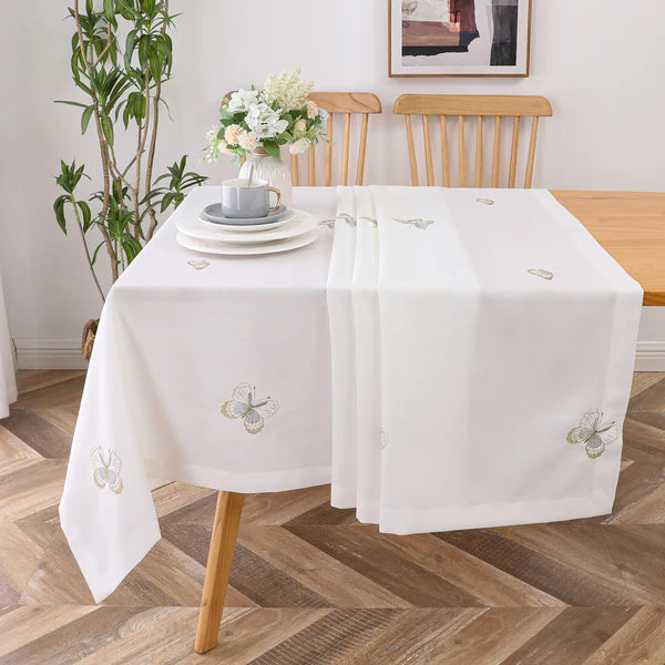 Upgrade your dining experience with our Majestic White Butterfly Tablecloth. The intricate design adds a touch of elegance to any table setting. Made with high-quality poly fabric, this durable tablecloth is perfect for any occasion. Experience luxury dining at its finest.