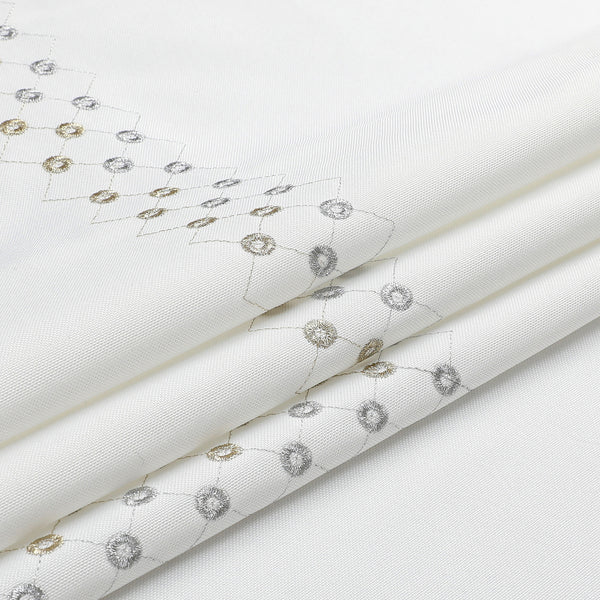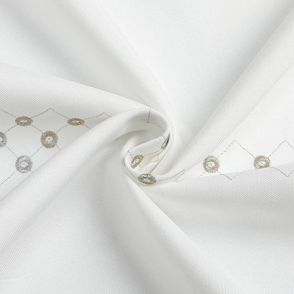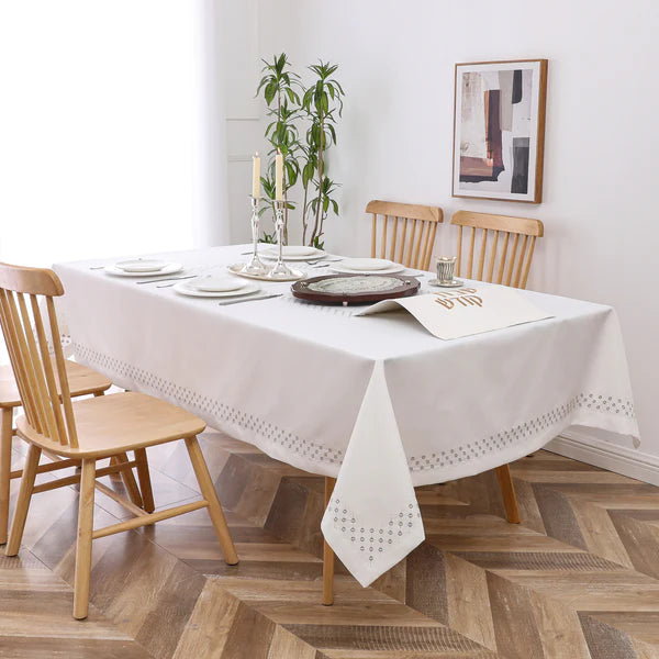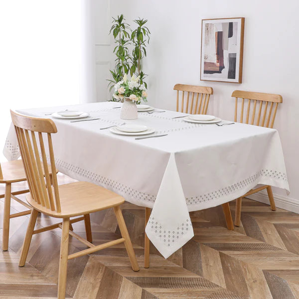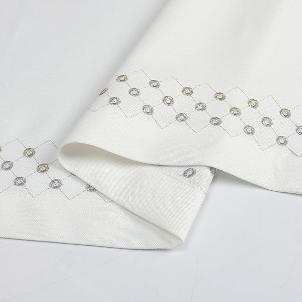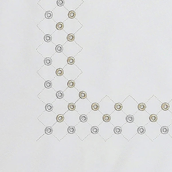 Upgrade your dining experience with our Majestic White Circles Tablecloth. The intricate design adds a touch of elegance to any table setting. Made with high-quality poly fabric, this durable tablecloth is perfect for any occasion. Experience luxury dining at its finest.