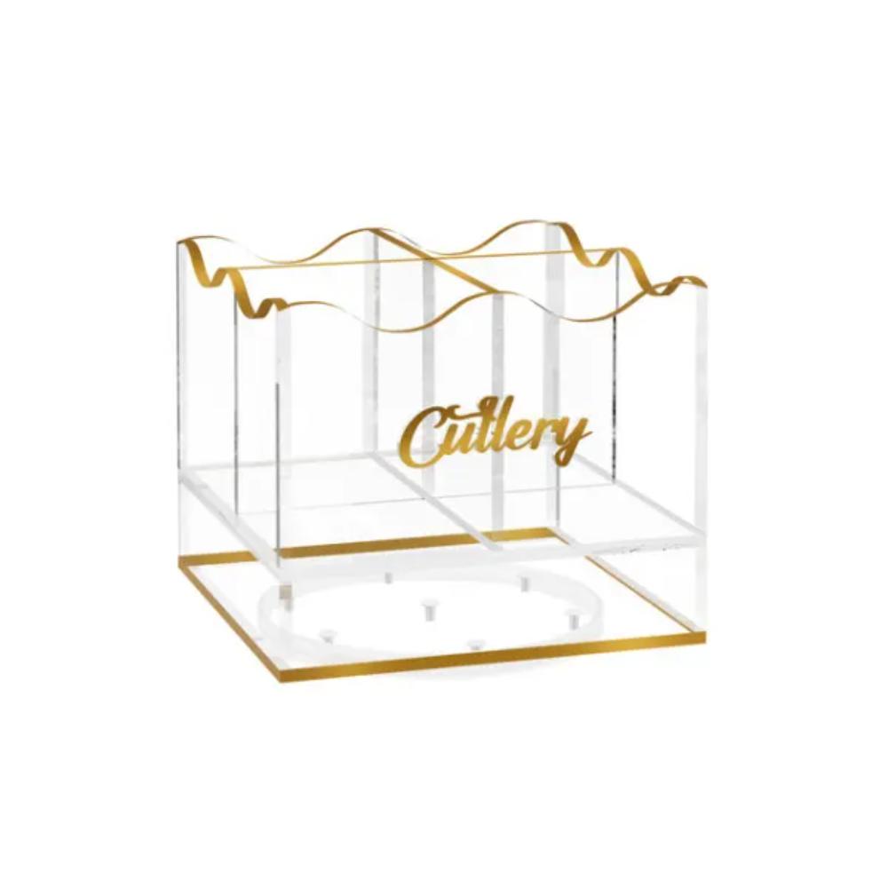 Introducing the Feldart Gold Swivel Wave Cutlery Holder, featuring a classic and elegant design. Organize your cutlery and napkins seamlessly with this holder's four compartments and swivel base. Elevate your table setting with this must-have accessory.