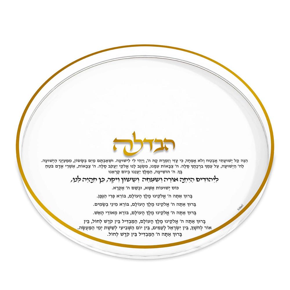 A true masterpiece, this Round Classic Havdalah Tray keeps hard-to-remove wax drippings off your table with this exquisite Havdalah tray. The imprinted, beautiful, clear Havdalah text makes for easy reading whilst holding that brimming kos. Give every Shabbos the grand finale.