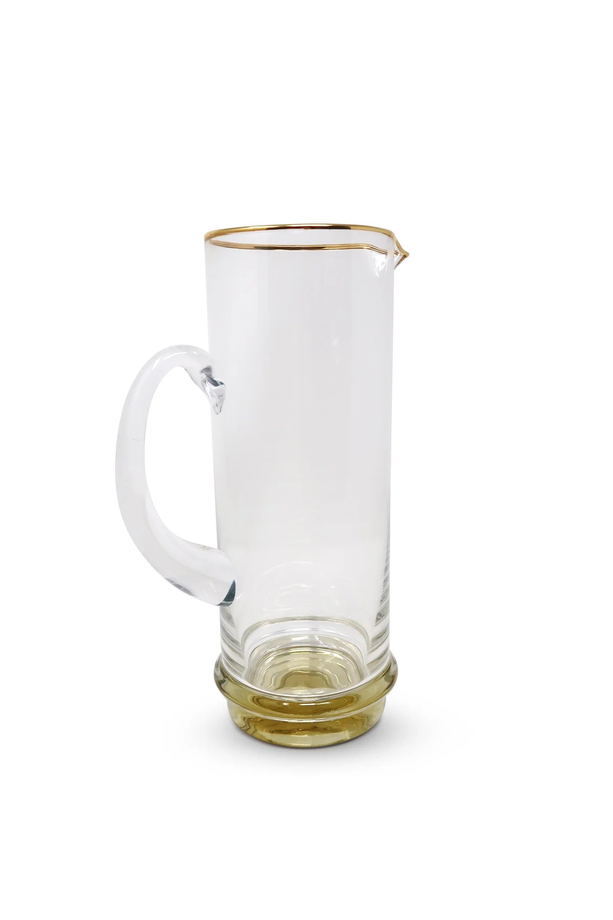Elevate your dining experience with our Gold Glass Pitcher. Its sophisticated design features a gold base and rim, adding a touch of elegance to any table setting. Crafted with premium materials, this pitcher effortlessly combines practicality and refinement, making it the ideal choice for serving your preferred drinks. Measures 4.25"D x 10.5"H and holds 44.5 oz. Enhance your gatherings with this refined pitcher.