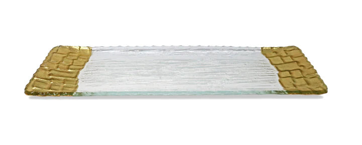Elevate your home decor and serving experience with our Gold Glass Tray. The shimmering gold foil accents will add a touch of opulence to any setting, while providing a sturdy and easy-to-clean surface. The durable design ensures long-lasting use for all your entertaining needs. Available in two sizes: 18"L x 6.25"W and 13.25"L x 5.25"W.