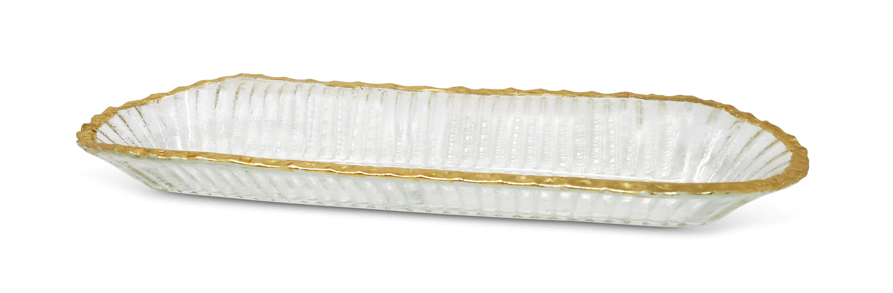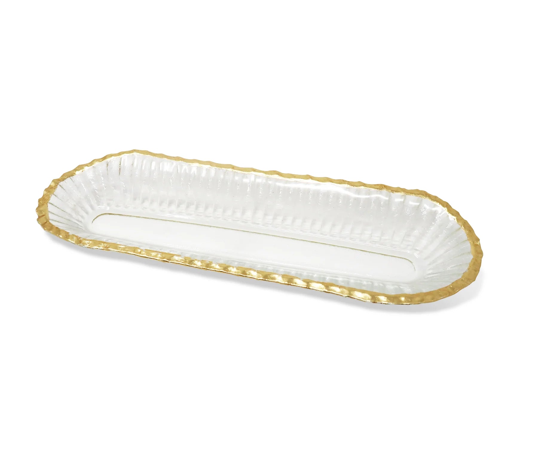 This elegant glass oval tray features a slim gold rim, making it a stylish addition to any table. Its sturdy construction ensures that it won't crack or break easily, giving you peace of mind when carrying and serving foods. The generous size provides ample space for snacks and drinks.