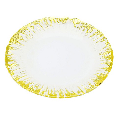 The Classic Touch Trophy Milky Glass Chargers feature a combination of metallic-trimmed serving pieces with gold or silver, as well as colorful dishes to mix and match