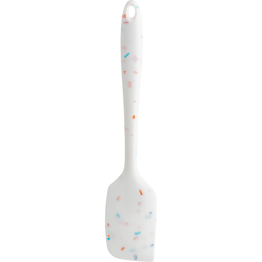 This spatula has fun confetti embedded into the silicone. The silicone material will not scratch cookware. It is stain and odor resistant and is heat safe up to 428°F. The one-piece construction allows for easy cleaning.