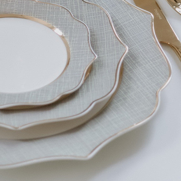 Nova 18-piece dinnerware set for 6 features an antique shape and design, making it perfect for parties, events, family dinners, and other occasions. The attractive colors and shape of these different plates make them a luxury addition to your kitchenware collection. The border of these plates are a unique color combination of dark grey with an overlapping gold design. Each plate in the set features a classic white base. This plate set includes pointed-shaped 6 salad plates, 6 dinner plates, and 6 soup plates. They are made of bone china so their quality and color remain the same even after years of long use. Add luxury and a festive vibe to your tablescape by adding these unique and stylish plates. This dinnerware set is for serving 6 people. The white color of the plates matches most of your table décor and complements the rest of your table décor accessories. Make a great first impression by serving your guests on these antique plates.