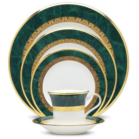 Fitzgerald showcases a broad edge of marbled green complemented by a sleek gold border and intricate etched gold details on pure white bone china. Along with place settings, Fitzgerald also includes a variety of serveware and complementary accessories. Elegantly designed and practical for everyday use, Fitzgerald is also dishwasher-safe, making clean-up a breeze.