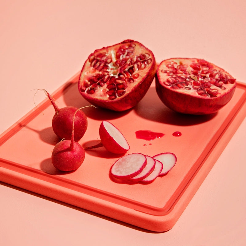 Prep with precision on this 23 x 33 cm chopping board crafted from upcycled nylon in a vibrant watermelon hue. Engineered for serious cooks, the non-slip feet keep it anchored during use while the silicone grooved juice catcher contains liquids effortlessly. The durable nylon surface resists knife dulling, won't absorb odors or stains, and maintains its integrity through countless meals. Dishwasher safe for convenient cleanup. A sustainable choice that performs as reliably as it looks.