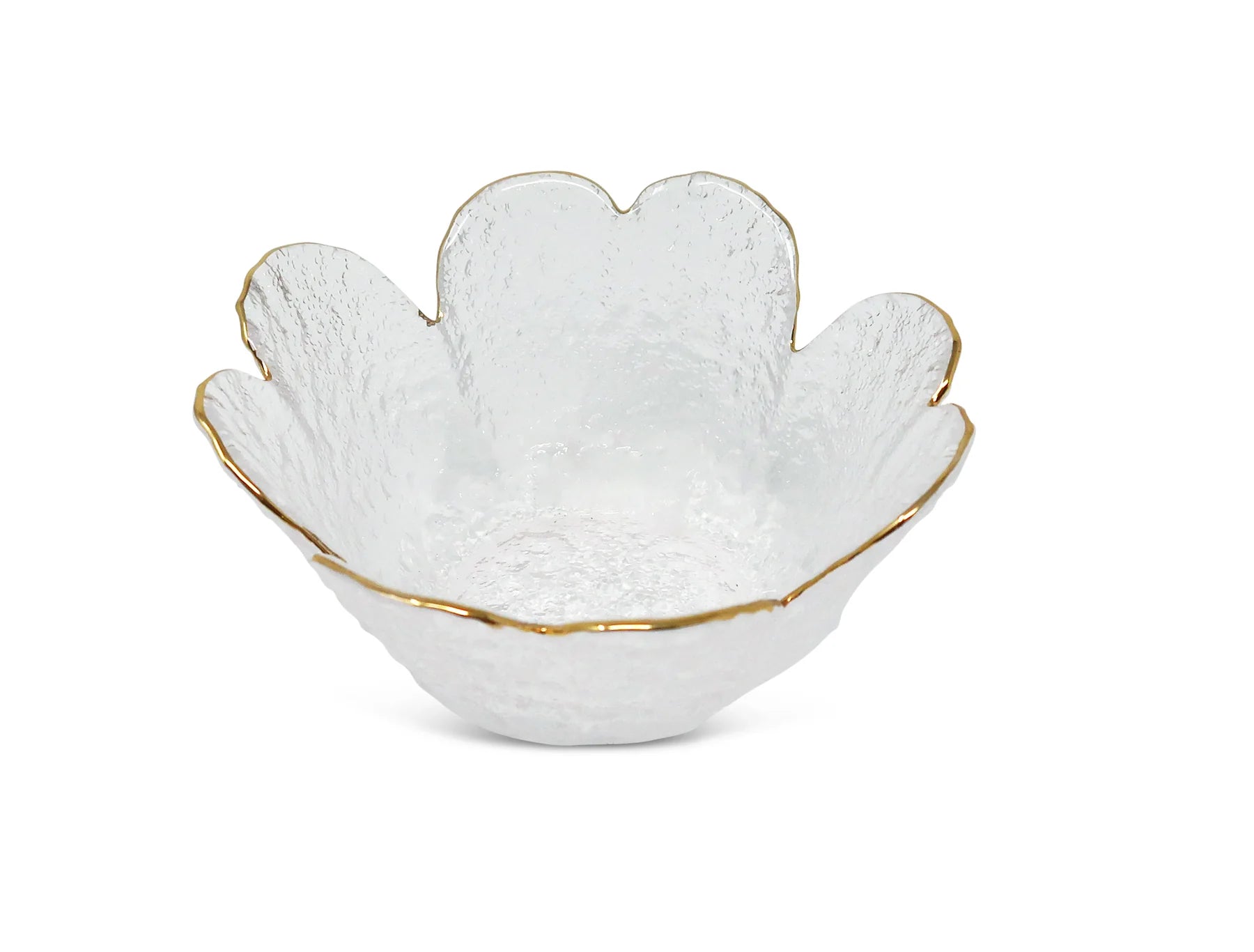 Enhance your dining experience with our Gold Flower Shaped Bowl. Crafted with high-grade materials and a stunning gold rim, this elegant bowl is available in 3 sizes. Perfect for serving your favorite dishes, it adds sophistication to any kitchen or dinner table. Sizes: Small - 5"D x 2.25"H, Medium - 5.5"D x 2.75"H, Large - 6.75"D x 3.25"H.