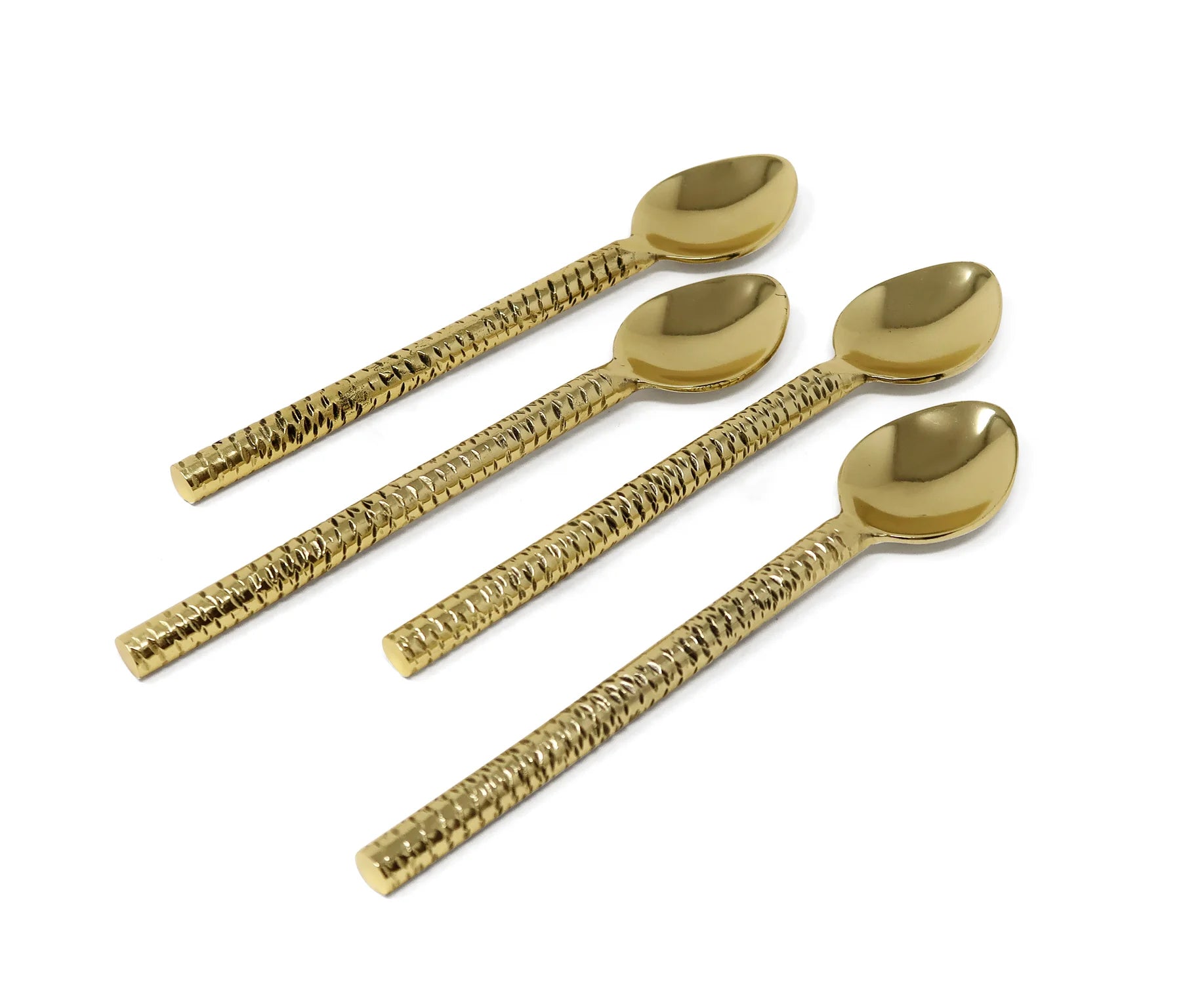 Elevate your dinner party with our Gold Hammered Dessert Forks. This set of 4 offers an elegant touch with its unique hammered design and luxurious gold color. Perfect for serving desserts or small bites, you'll impress your guests with this versatile must-have set. Measures 5"L.
