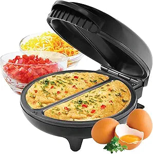 Effortlessly make perfect omelets with the Hauz Black Electric Omelet Maker. Its non-stick surface makes for easy cooking and cleaning, while the two-portion capacity allows for quick meals. With the versatile use and quick preheat time, you can create a variety of dishes in no time. Stay safe with the cool-touch handle and non-slip feet.