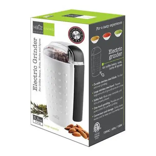Experience fast and even grinding with the Hauz ACG326 Electric Grinder. Its durable stainless steel blade and one touch control provide perfect results every time. With a large 3.5oz capacity, you can prepare large quantities of ground spices at once. Store excess cord safely and keep your countertop neat with the convenient cord storage feature. The safety lock ensures the blade stays immobile until the lid is securely in place. Perfect for coffee beans, nuts, herbs, and spices.
