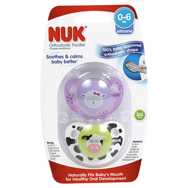Soothe and Calm baby with NUK® Cute as a Button Pacifiers. Featuring adorable farm animals, sure to bring a smile to anyone's face. The button style has a silicone nipple. Sold as a 2 pack, these are button pacifiers with orthodontic silicone nipples. Size 1 is appropriate for infants 0 to 6 months of age. All NUK® pacifiers are BPA Free. These pacifiers are MADE IN GERMANY and packaged in the USA.