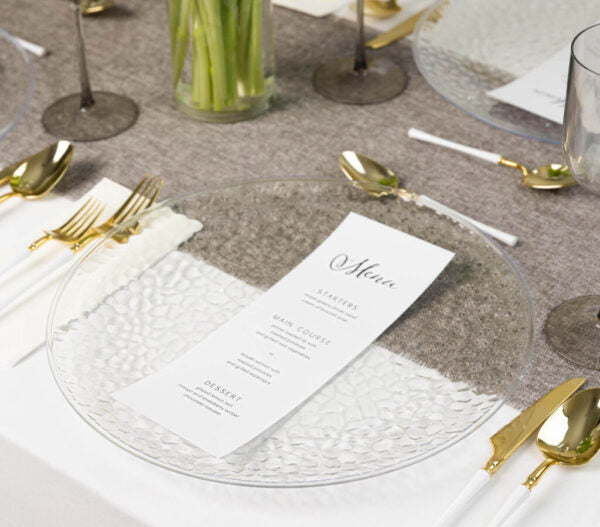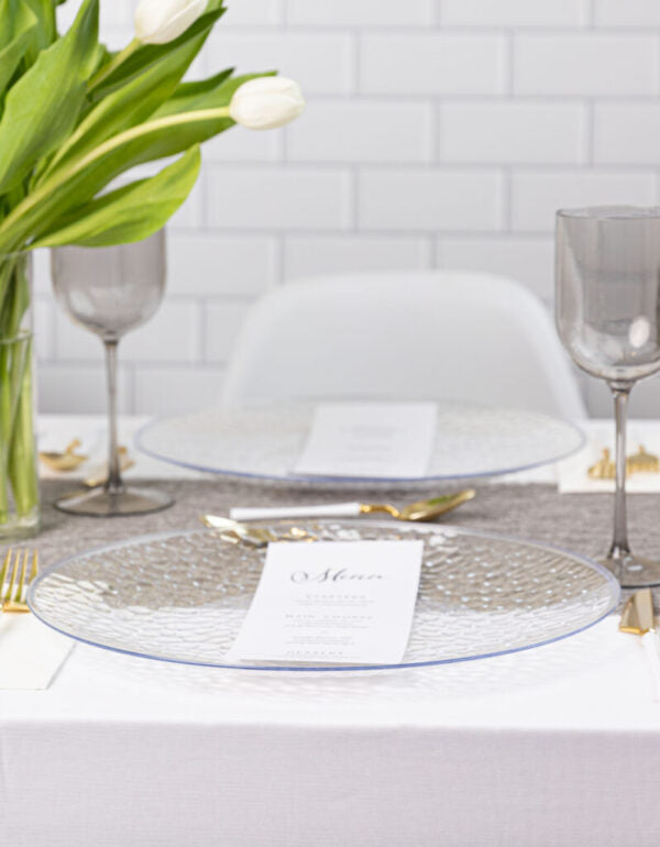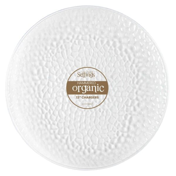 Elevate your dining experience with our four-piece set of 13-inch Organic Clear Hammered Chargers. Crafted from premium materials, these disposable plates deliver an elegant, sophisticated look to any table setting. Perfect for special occasions or everyday use, their organic design adds a beautiful touch to any event.