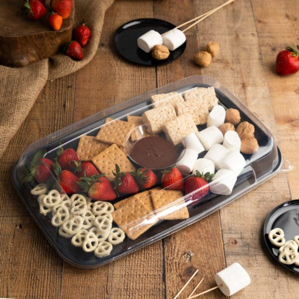Introducing a versatile and reliable solution to meet your food serving needs- the 18″x11″ organic tray lid. Its optimized dimensions make it a perfect fit for our 18″x11″ rectangle-shaped trays, ensuring airtight sealing and safeguarding against contamination. The sleek and clear design of this lid enables effortless handling and easy viewing of contents, making it perfect for catering events, restaurants, or home kitchens. An essential accessory for quality food presentation and protection, this plastic tray lid is a trustworthy choice for all your food service needs.