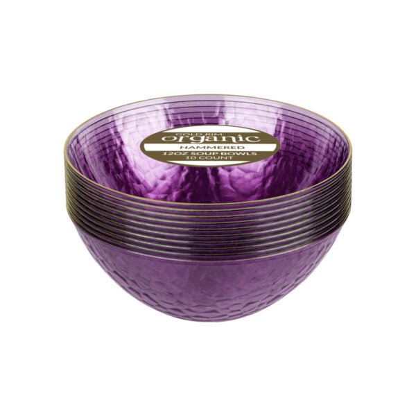 Organic and responsibly-sourced, these 12 oz plastic soup bowls are perfect for enjoying your favorite soups. The vibrant purple and gold colors add a stunning accent to your kitchen or dining room. Perfect for everyday use or special occasions. Serve up to 10 people with one pack.